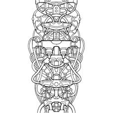 I started making these drawings in my sketchbook around 1998 as I sat on the windowsill in the long narrow hallway of our first Brooklyn apartment. Seated next to the airshaft, I would draw interconnected parts down the right side of a page. One night I noticed the machine I was drawing reflected in the dark window, and it seemed to come alive. The drawings came together to form the Machinespine Corporation.