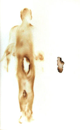 "Defining Acts" is the title I gave this suite of nine small figures, because each figure originated as an identically neutral image that I copied and cut out. Just as the lives of people are defined by their actions, each figure became unique through the act of its burning. Thus the formative "life" of each figure existed in the short span of its destruction. The burned image on the paper is merely a distorted record of that life.